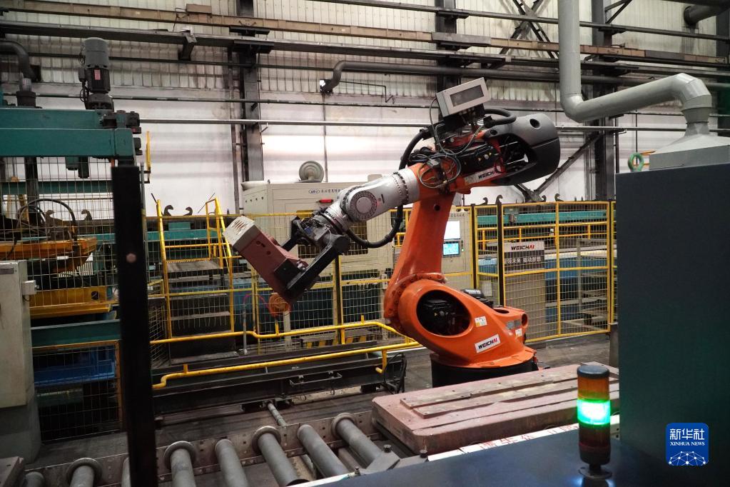 在位于山东省潍坊市的潍柴(潍坊)材料成型制造中心的生产车间,一台机械手在工作(9月19日摄)。