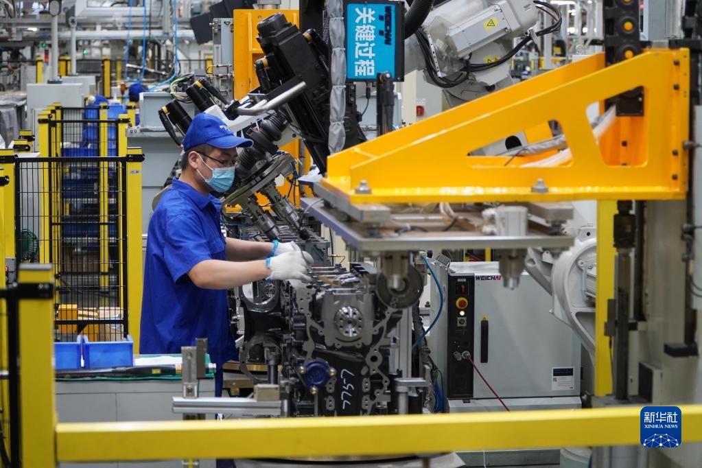 在山东省潍坊市,潍柴集团的工作人员在一条新的生产线上安装调试设备(9月19日摄)。