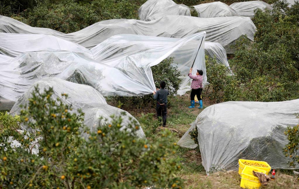 广西融安县大坡乡岗伟村村民在给金桔树盖膜。