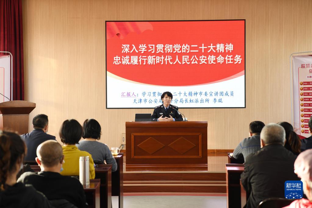 党的二十大代表、天津市公安局南开分局长虹派出所副所长李琨日前走进南开区长虹街道办事处,开始了她“深入学习贯彻党的二十大精神”的第23场宣讲。“对到场人员的情况了解越多,越有助于我找准宣讲角度,党的二十大精神的传播效果就会越好。”宣讲开始前,她细心地向街道办事处工作人员了解情况。从一个短视频、若干组图片开始,李琨用一个个身边事把党的二十大的新思想、新观点传递到群众耳边。