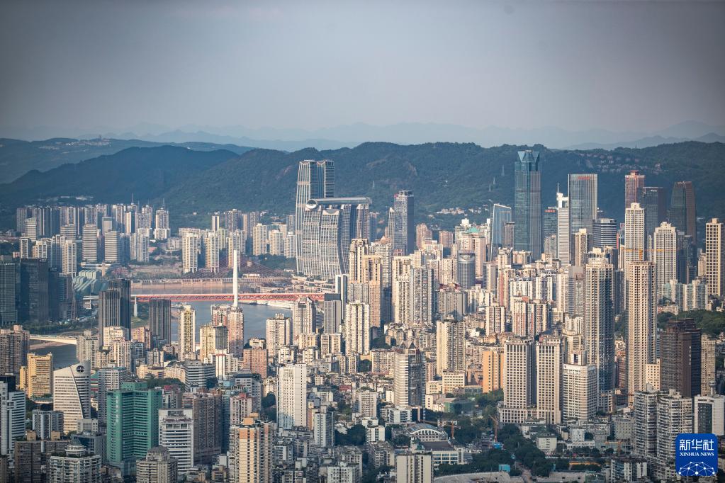 在长江(右侧)、嘉陵江(左侧)两江环绕中的重庆中心城区(2022年7月13日摄,无人机拼接照片)。