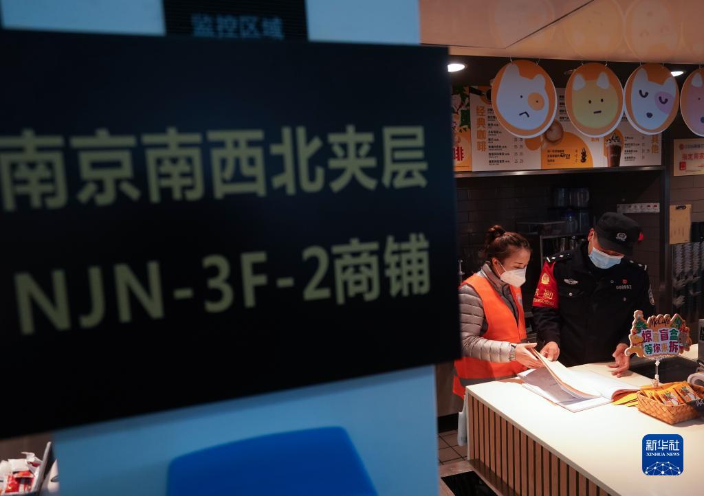 南京铁路公安处南京南站派出所民警和志愿者一起在南京南站一家商户检查防火巡查记录(2021年11月25日摄)。