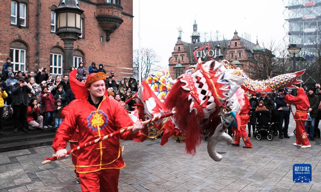 1月21日,人们在丹麦首都哥本哈根市政广场观看舞龙表演。