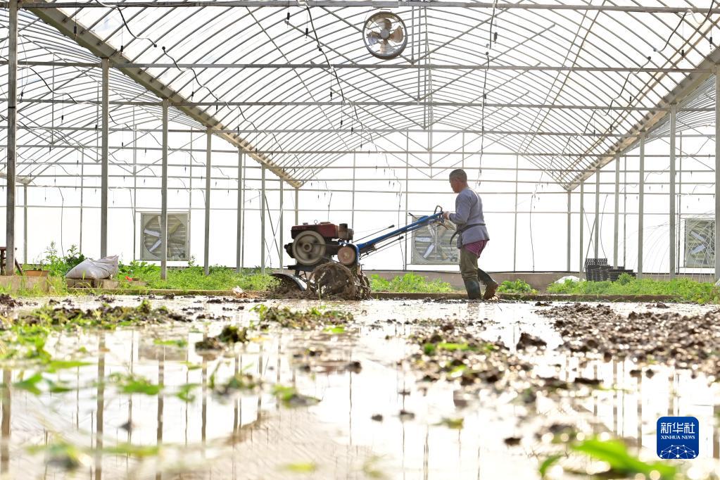 1月29日,在湖南省娄底市双峰县青树坪镇归古新村,农民驾驶农机在大棚内整地。