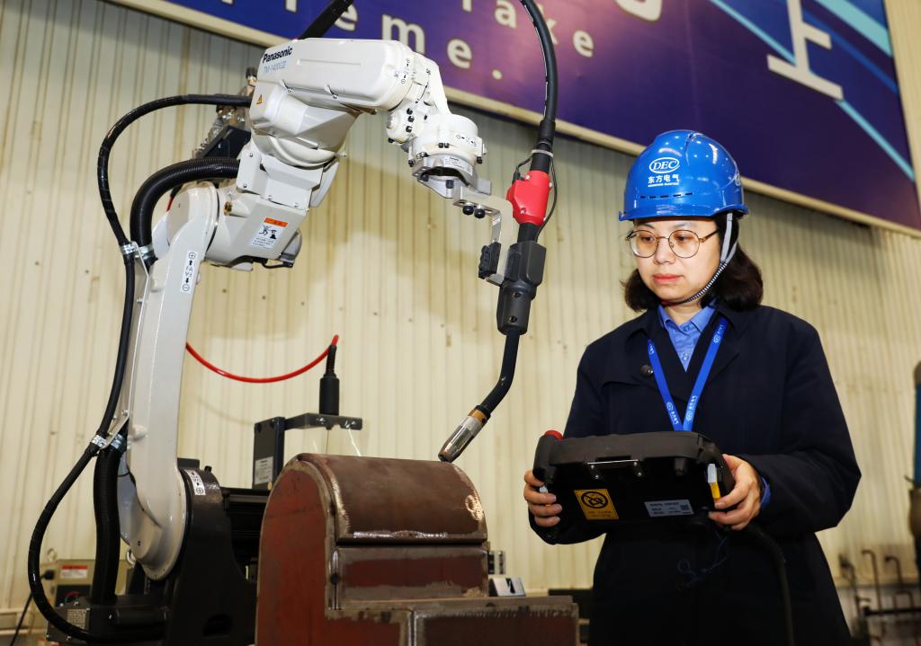 全国人大代表曹天兰正在进行焊接机器人模拟试验。贾伟明摄