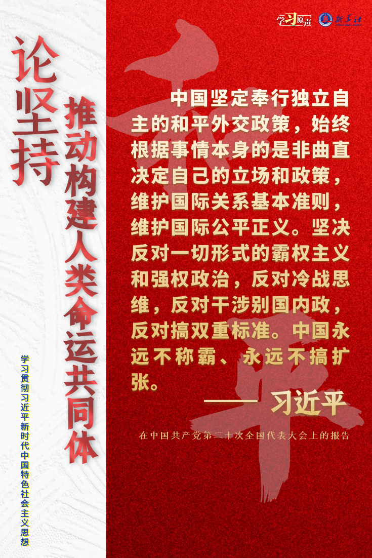 当前,世界之变、时代之变、历史之变正以前所未有的方式展开。人类社会面临前所未有的挑战。世界又一次站在历史的十字路口,何去何从取决于各国人民的抉择。中国始终坚持维护世界和平、促进共同发展的外交政策宗旨,致力于推动构建人类命运共同体。