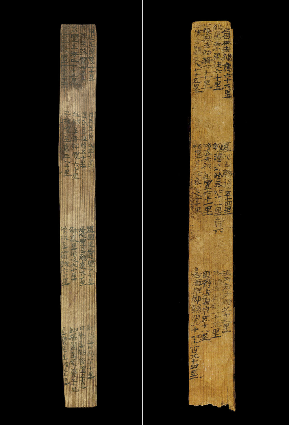 拼版照片:汉简《居延里程简》(左图)和《悬泉里程简》。1974年出土于今内蒙古自治区额济纳旗破城子遗址的“居延里程简”,详细记载了从汉代长安出发至张掖郡20个驿置名称及间隔里程。1990年出土于敦煌悬泉置遗址的“悬泉里程简”,记载了河西走廊地区武威郡到敦煌郡12个驿置的详细信息。新华社发(甘肃简牍博物馆供图)