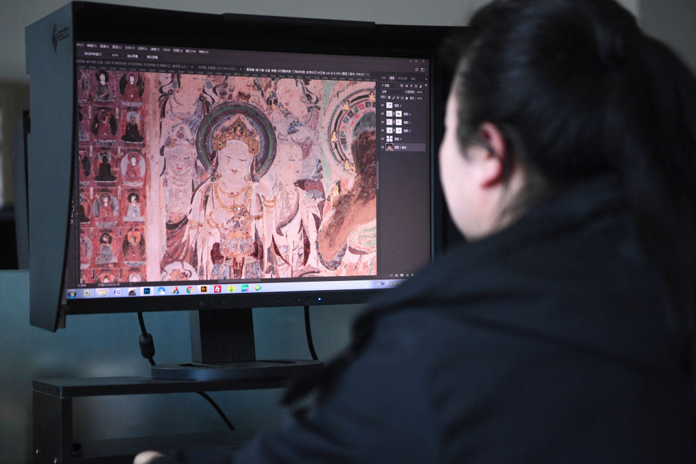 敦煌研究院文物数字化保护团队图像处理人员年海丽在拼接壁画图像(2023年4月25日摄)。新华社记者 陈斌 摄