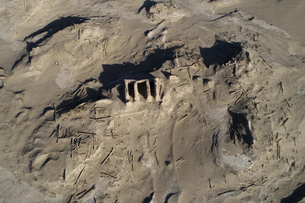 如今的楼兰遗迹轮廓依稀可辨。通过航拍俯瞰,可见城郭基本为方形,占地面积10.8万平方米。楼兰故城东北区,坐落着残高约10.4米的佛塔遗址,不远处有一处官署遗存,考古工作人员叫它“三间房”。虽经风沙侵蚀,遗迹依稀可见,房屋用土块垒砌,东西两间较狭小,中间一间较宽大,形制规格较高,布局严谨。