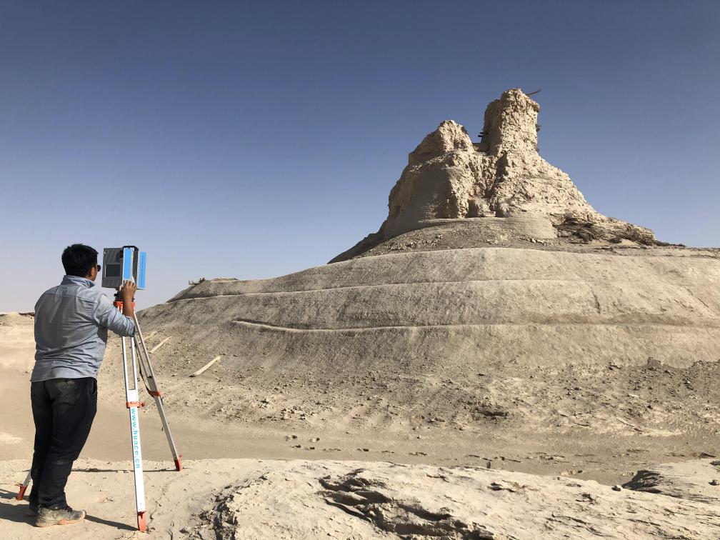 技术专家使用三维激光扫描技术为佛塔遗址建立数字化档案(2020年10月20日摄)。新华社发(中铁西北科学研究院有限公司供图)