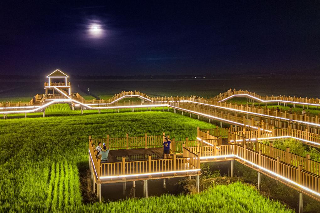 看山,望水,闻阵阵稻花香。三合村水稻产业风生水起,旅游业也跟着发展起来。漫步在三合民俗风情步行街,两侧是风格古朴的建筑群落,小院庭阶悠远,韵味深长。稻田观光景区,游客们愉快地走在木栈道上,观赏万亩稻田。在民宿区,游人回归大自然,“睡”在风景里。